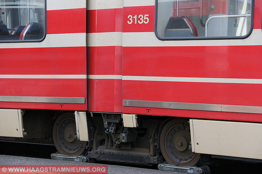 Op donderdagmiddag 30 mei 2024 staat aan het eindpunt Duindorp de 3135/12 op het binnenspoor met het tweede draaistel op asbreukwagentjes. De tram is rond het middaguur op lijn 12 gestrand met een probleem bij het tweede draaistel.