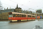 Op de Schedeldoekshaven staat de 3147/1 te wachten om linksaf het Spui op te draaien. De 3147 is over de gehele lengte geschampt door het achterste deel van de B-bak van de 3098.