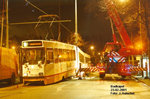 De kraan van de brandweer herspoort de tram.