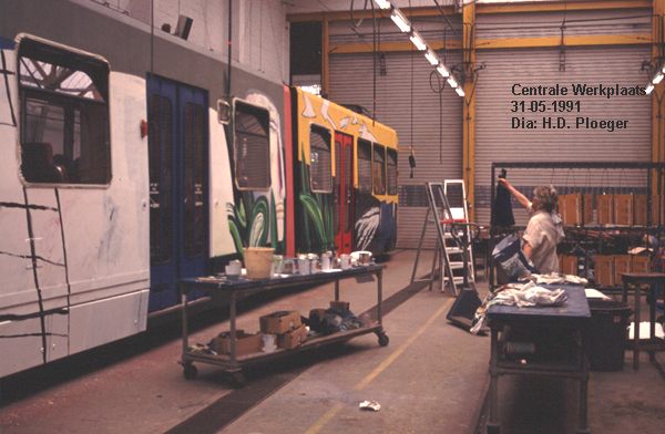 Omdat de HTM zelf niet over een spuiterij beschikt, wordt de tram geschilderd in de werkplaats van de NS te Tilburg. Het transport geschiedt met een speciale oplegger over de weg.