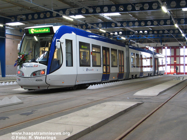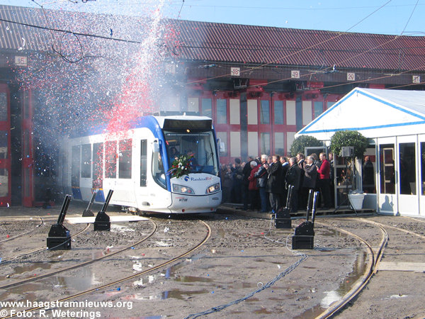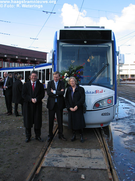 Op donderdagochtend 2 maart 2006 is de HTM 4002 gepresenteerd op het remiseterrein ZBG. Na enkele toespraken in een feesttent rijdt wethouder Bruins de tram naar buiten toe.