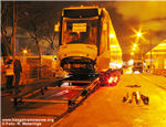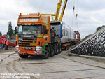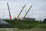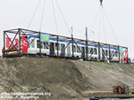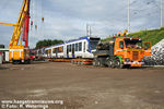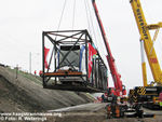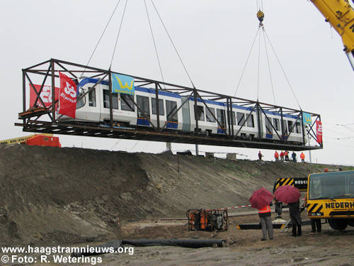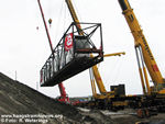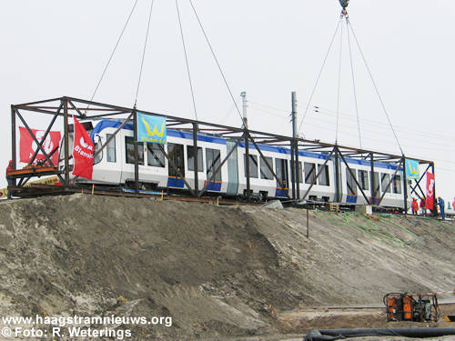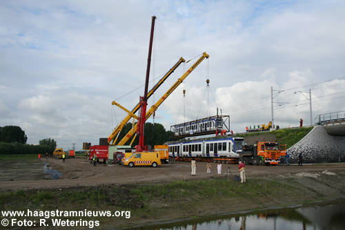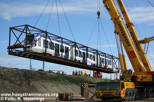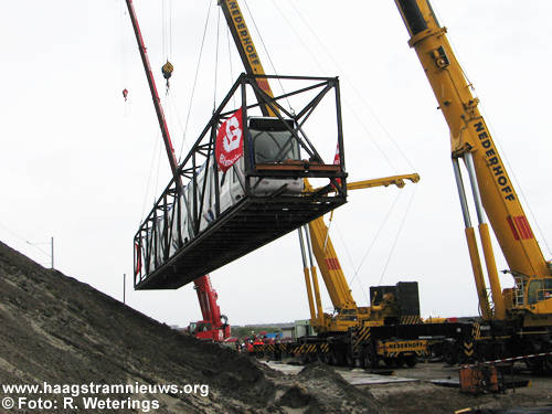 Nadat de tram is vastgesjord wordt het geheel door twee grote kranen op het talud getild.